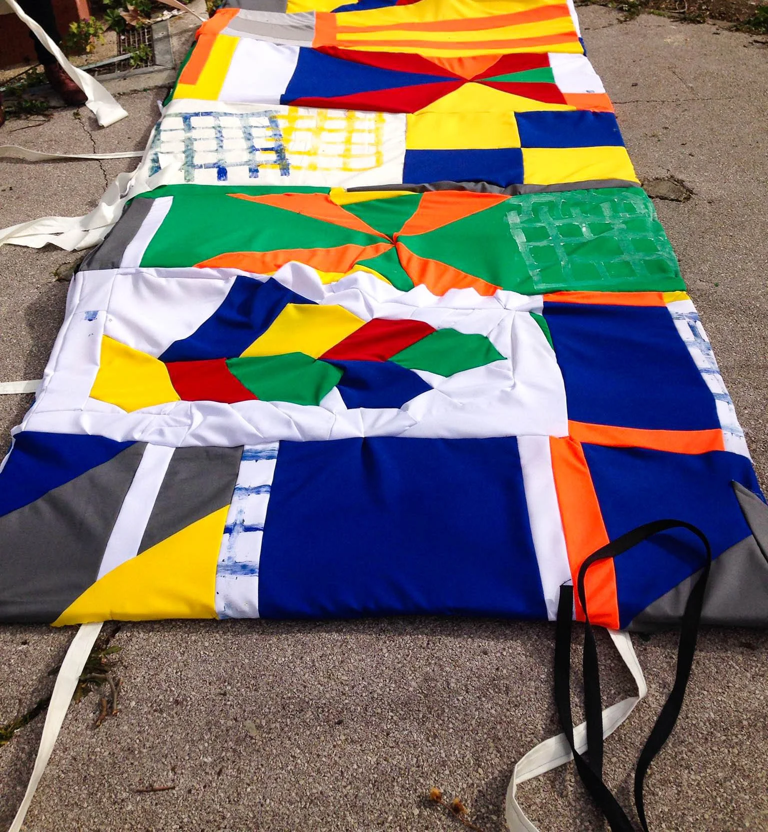 Using geometric symbols and bright colors, this work references the